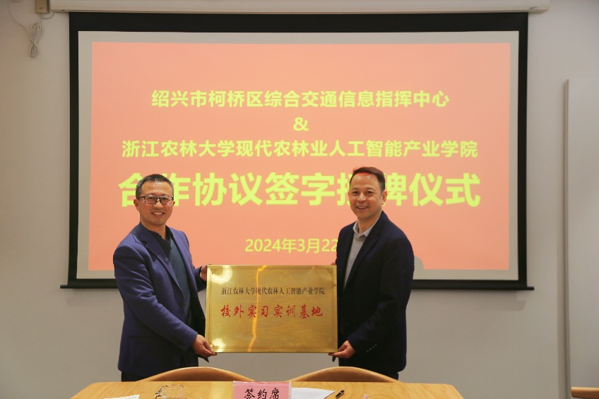 仪式上,张洪涛副经理与柯桥区综合交通信息指挥中心负责人陈立明代表双方签署协议。仪式上还举行了K1体育现代农林人工智能产业公司校外实习实训基地揭牌仪式和校外导师聘任仪式。标志着双方正式建立了战略合作伙伴关系,也体现了双方对未来合作的美好期待和坚定信心。
