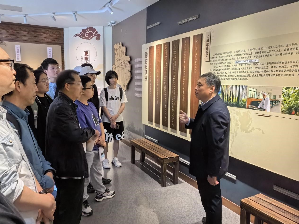 上田村,素有“茶香竹海、文武上田”的美誉。这里历史悠久,风景秀丽,民风淳朴,人杰地灵,文化多元,其中更是以“十八般武艺”闻名。同学们在上田村党总支书记潘曙龙的带领下,先后参观了村庄的展览馆、大礼堂、图书室等,村庄环境综合整治工程不仅使得村庄环境变得优美整洁,“文武上田”的口号提出也促进了村庄的精神文明建设。潘书记将上田村的悠悠过往、乡贤能人和“文武”当下娓娓道来,美丽乡村建设成功案例的画卷在同学们的眼前徐徐展开,全方位展现了乡村治理的实践和最新成果。
