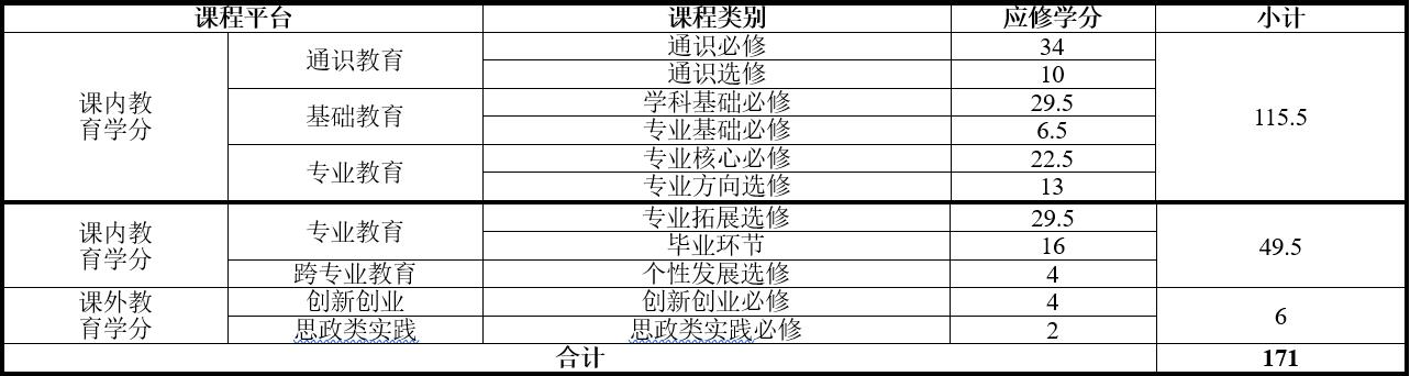 毕业最低学分为171学分,其中课内教学学分为165学分,课外教育学分为6学分。具体如下: