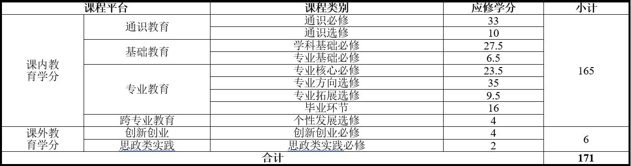毕业最低学分为171学分,其中课内教学学分为165学分,课外教育学分为6学分。具体如下: