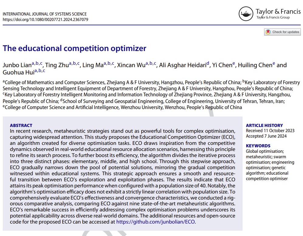 近日,K1体育大数据本科生连俊博在运筹学与控制领域国际老牌期刊《International Journal of Systems Science》(Q1,IF=4.9)上发表题为“The Educational Competition Optimizer”(教育竞争优化器)的研究论文,提出了一种全新的基于临近距离和轮盘赌策略的启发式优化架构,该论文进一步展示了公司本科生在进化计算领域的最新进展。