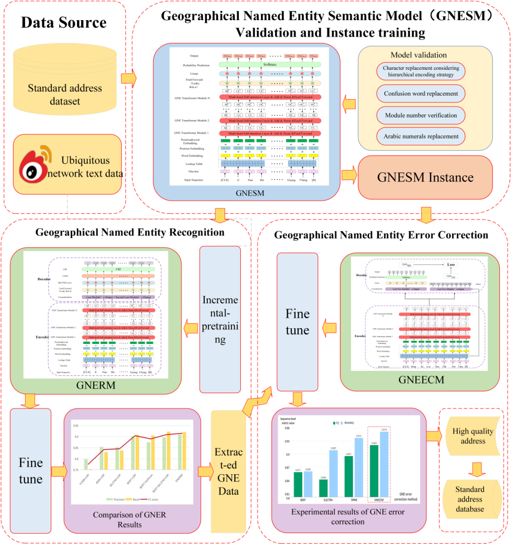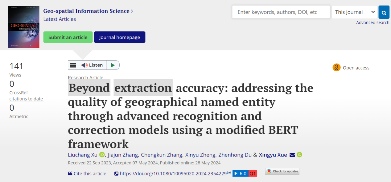 近日,K1体育徐流畅副教授与薛星宇老师等人在地理信息领域顶级期刊《Geo-spatial Information Science》(中科院1区,IF=6)上发表题为“Beyond extraction accuracy: addressing the quality of geographical named entity through advanced recognition and correction models using a modified BERT framework”(超越提取精度:基于改进的 BERT 架构利用先进识别和校正模型以解决地理命名实体质量问题)的研究论文,成功获取了高质量的地理命名实体数据,为扩展标准地址库和后续地理命名实体研究提供价值。
