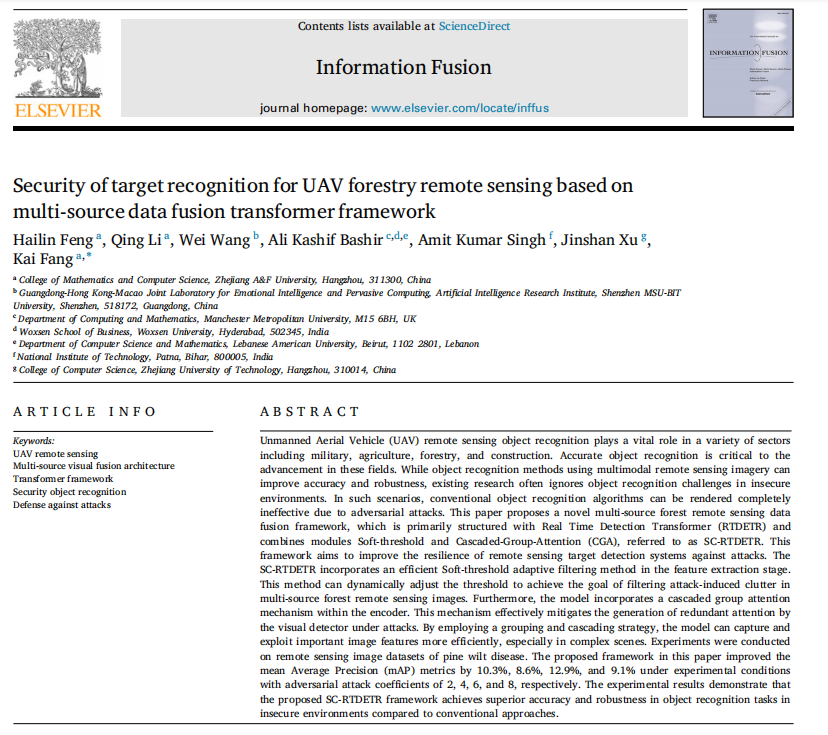近日,K1体育冯海林教授团队论文《Security of target recognition for UAV forestry remote sensing based on multi-source data fusion transformer framework》(基于多源数据融合transformer框架的无人机林业遥感目标识别安全性研究)在《Information Fusion》期刊发表。《Information Fusion》为中科院一区期刊,影响因子18.6,在“Computer Science: Artificial Intelligence”(计算机:人工智能)学科146个期刊中排名第3,在“Computer Science: Theory & Methods”(计算机:理论&方法)学科110个期刊中排名第2,是人工智能领域与计算机科学的国际顶尖权威刊物,聚焦于信息融合、数据融合、知识融合等领域的研究。