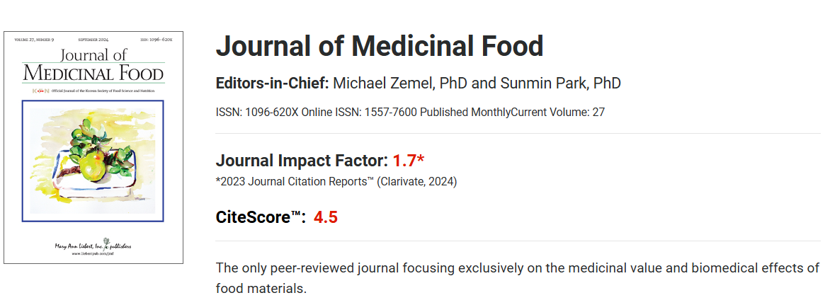 论文第一作者是大数据21级本科生竺婷,通讯作者是校科研育人名师工作室负责人。Journal of Medicinal Food期刊是一本专注于食品材料的药用价值和生物医学作用的国际同行评审期刊,其2023年影响因子为1.73。本研究工作依托K1体育科研育人名师工作室,并得到K1体育的大力支持,使得员工可以在无量之课外学术空间中得以自由翱翔,为优秀员工未来之发展奠定坚实基础。