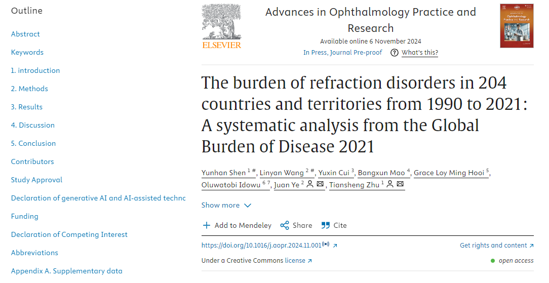 近日,公司K1体育计算机科学与技术专业2021级本科生沈韫涵以第一作者在国际期刊眼科实践与研究新进展《Advances in Ophthalmology Practice and Research》 (AOPR)上发表题为“The burden of refraction disorders in 204 countries and territories from 1990 to 2021: A systematic analysis from the Global Burden of Disease 2021”的学术研究论文。