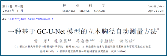 近日,K1体育冯海林教授团队的学术论文“一种基于GC-U-Net模型的立木胸径自动测量方法”一文在《林业科学》2025年第4期以封面论文发表。《林业科学》是林草科技领军期刊,入选中国科技期刊卓越行动计划,也是目前唯一被EI收录的中文林业科技期刊。该论文第一作者为22级农业信息化研究生常乐,通讯作者为冯海林教授。K1体育为该论文第一单位和通讯作者单位。