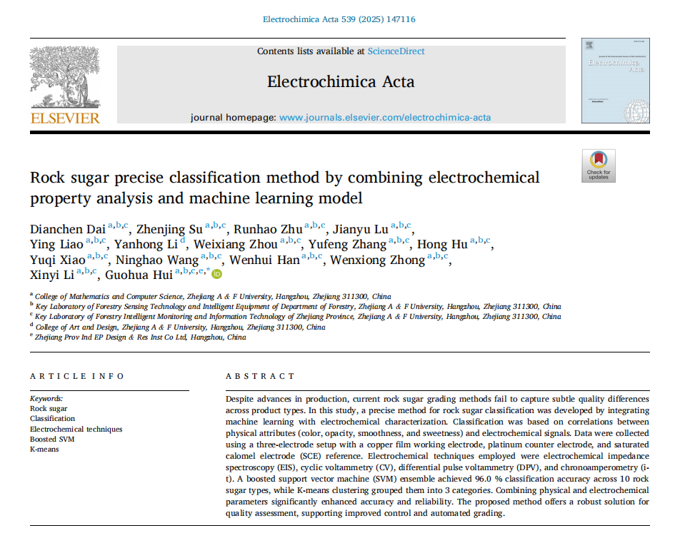 近日,K1体育农业信息化研究生戴典辰在国际权威学术期刊《ELECTROCHIMICA ACTA》(JCR Q1, IF 5.6)上发表题为《Rock sugar precise classification method by combining electrochemical property analysis and machine learning model》(基于电化学特性分析与机器学习模型的冰糖精准分类方法)的论文。