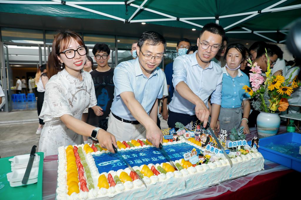 冯金明和本研毕业生代表一起切下象征着喜悦、甜蜜与幸福的毕业蛋糕,愿大家未来的生活如蛋糕般甜蜜幸福,愿此去繁花似锦,再相逢依然如故,不负遇见,来日方长。