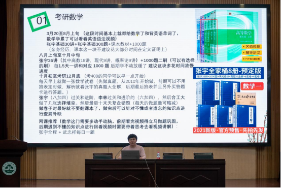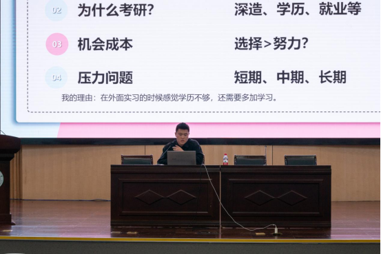 首先戴丹老师以考研人数、应往届录取率、公司硕士点等方面分析了当下的考研形势,重点介绍了公司去年的考研情况。希望同学们能够努力进取,认真选择理想的公司去备战,适应当今竞争激烈的社会。