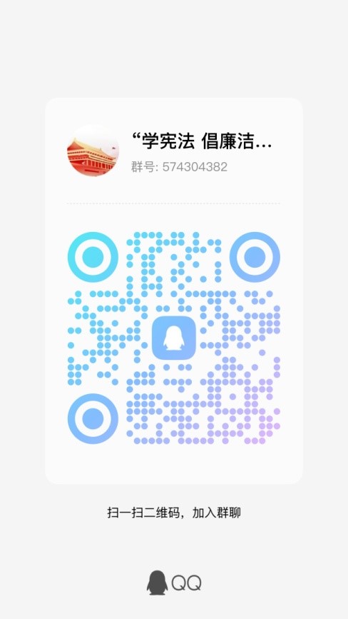 即日起至2023年12月13日17:00前,请参赛选手将报名表(见附件)发送到qq邮箱2893479143@qq.com,文件以“学宪法 倡廉洁 守诚信”演讲比赛+专业班级+姓名+联系方式命名。参赛选手请扫描下方二维码加入比赛qq群(群号:574304382)。