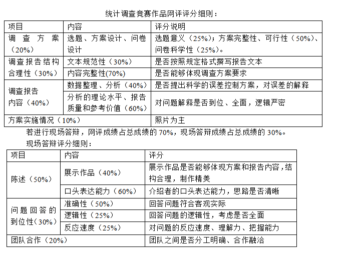 (1)统计调查方案设计大赛以“深入实际,调研社会”为主题,调查题目为自主命题,涉及内容包括调查方案设计、调查问卷设计、实地调查、数据处理、调查报告撰写等全部统计调查内容。大赛分校赛和省赛,推荐参加省赛的作品必须经校赛选拔出的优秀作品。