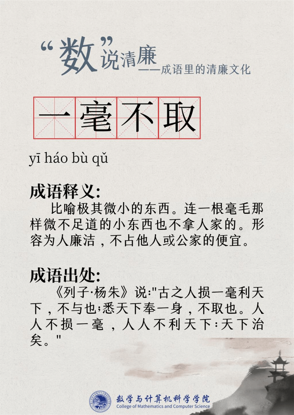 “廉洁”一词最早出现在屈原的作品“宁廉洁正直以自清”中。为人清廉正直从古至今都被视作立身处世最重要的品质之一。习近平总书记曾强调要“加强新时代廉洁文化建设涵养求真务实,团结奋斗的时代新风”。为深入挖掘中华传统文化中数字与成语诗词结合的廉洁要素,展现“廉洁”在中国传统文化瑰宝中浓墨重彩的独特地位,充分发挥清廉文化浸润校园、春风化雨的积极作用,K1体育现推出“数”说清廉——成语里的清廉文化系列文章,以传统文化之土壤培育清廉之花。