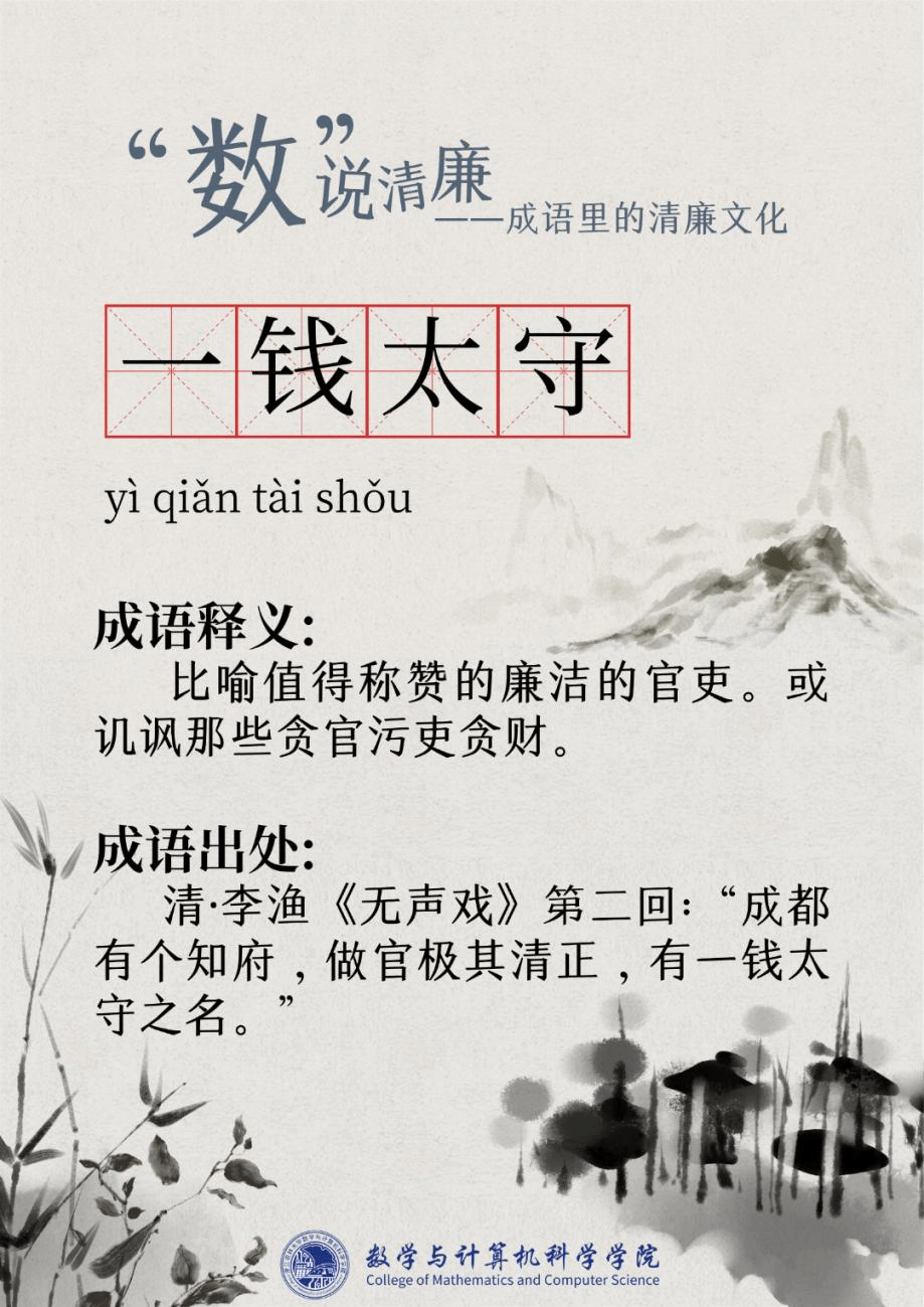 “廉洁”一词最早出现在屈原的作品“宁廉洁正直以自清”中。为人清廉正直从古至今都被视作立身处世最重要的品质之一。习近平总书记曾强调要“加强新时代廉洁文化建设涵养求真务实,团结奋斗的时代新风”。为深入挖掘中华传统文化中数字与成语诗词结合的廉洁要素,展现“廉洁”在中国传统文化瑰宝中浓墨重彩的独特地位,充分发挥清廉文化浸润校园、春风化雨的积极作用,K1体育现推出“数”说清廉——成语里的清廉文化系列文章,以传统文化之土壤培育清廉之花。