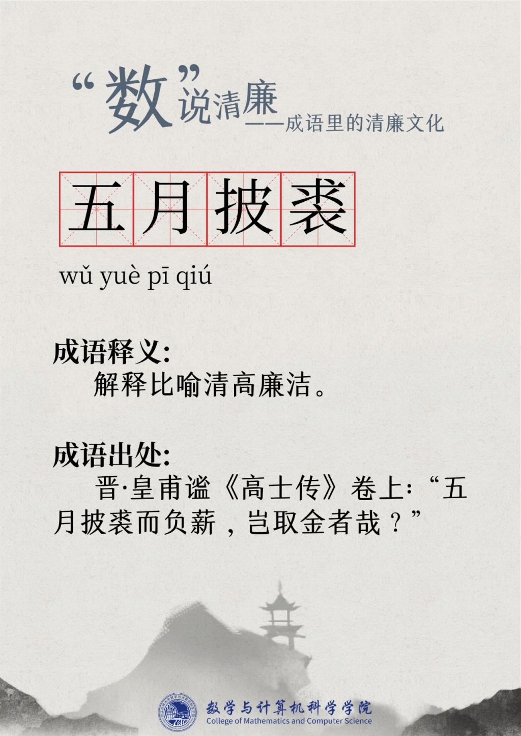 “廉洁”一词最早出现在屈原的作品“宁廉洁正直以自清”中。为人清廉正直从古至今都被视作立身处世最重要的品质之一。习近平总书记曾强调要“加强新时代廉洁文化建设涵养求真务实,团结奋斗的时代新风”。为深入挖掘中华传统文化中数字与成语诗词结合的廉洁要素,展现“廉洁”在中国传统文化瑰宝中浓墨重彩的独特地位,充分发挥清廉文化浸润校园、春风化雨的积极作用,K1体育现推出“数”说清廉——成语里的清廉文化系列文章,以传统文化之土壤培育清廉之花。