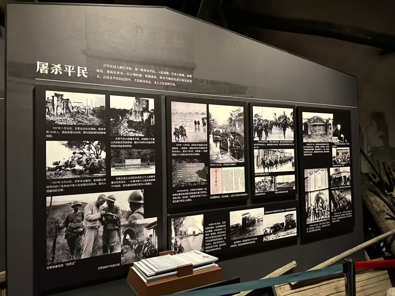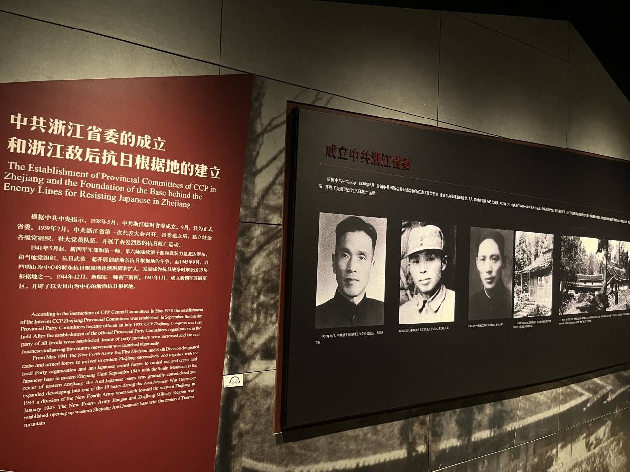 1945年8月15日,日本帝国主义战败宣布无条件投降,富阳长新乡宋殿村被指定作为侵浙日军投降的唯一地点,因此成为见证浙江人民抗战胜利的重要纪念地。展厅气氛庄严肃穆,通过大量的档案文献、图片浮雕和复原造型记载了那一段浴血抗战史,再现了中国人民同日本侵略者英勇斗争的光辉历程与艰苦卓绝的抗战之路。