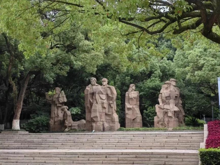 在与纪念碑遥相呼应处有一大型烈士群雕,高6.5米,采用赭红色花岗岩雕凿,依山体天然青灰岩错落有致地布局,以刀劈斧斫的沧桑感,再现了先烈们宁死不屈、气贯长虹的风采。