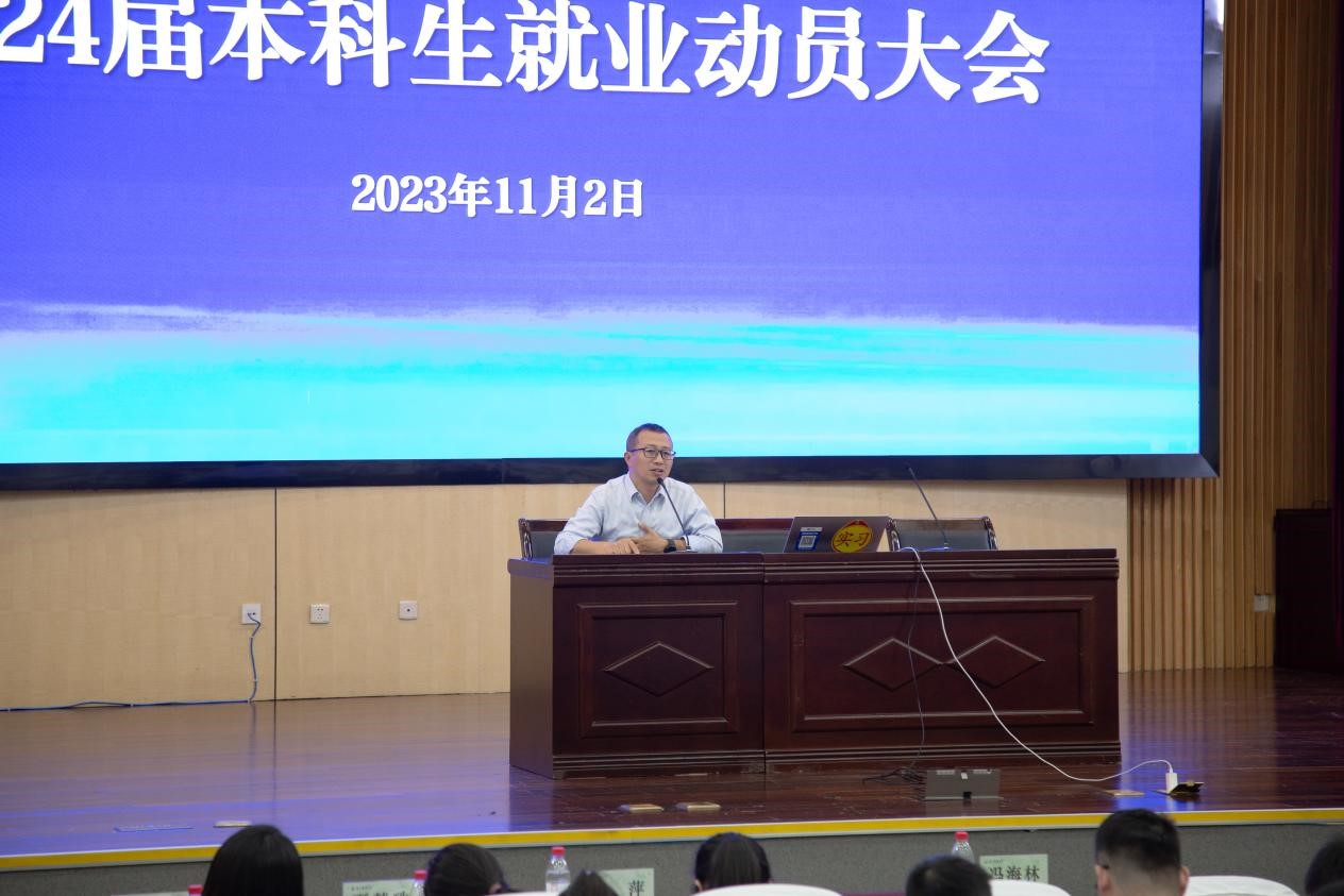 冯海林做动员讲话,他指出,就业是人生中重要的一次主动选择,与同学们过往普遍经历的被动选择不同。关于就业选择有三点希望和建议:其一,锚定目标,做多手准备;其二,认清形势,抓住所有可能的资源;其三,合理规划,安全意识不能松懈。