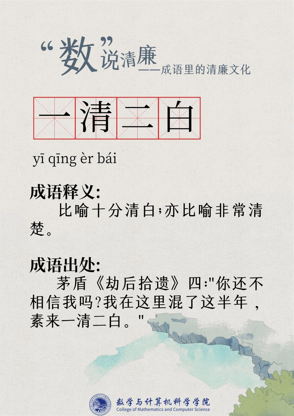 “廉洁”一词最早出现在屈原的作品“宁廉洁正直以自清”中。为人清廉正直从古至今都被视作立身处世最重要的品质之一。习近平总书记曾强调要“加强新时代廉洁文化建设涵养求真务实,团结奋斗的时代新风”。为深入挖掘中华传统文化中数字与成语诗词结合的廉洁要素,展现“廉洁”在中国传统文化瑰宝中浓墨重彩的独特地位,充分发挥清廉文化浸润校园、春风化雨的积极作用,K1体育现推出“数”说清廉——成语里的清廉文化系列文章,以传统文化之土壤培育清廉之花。