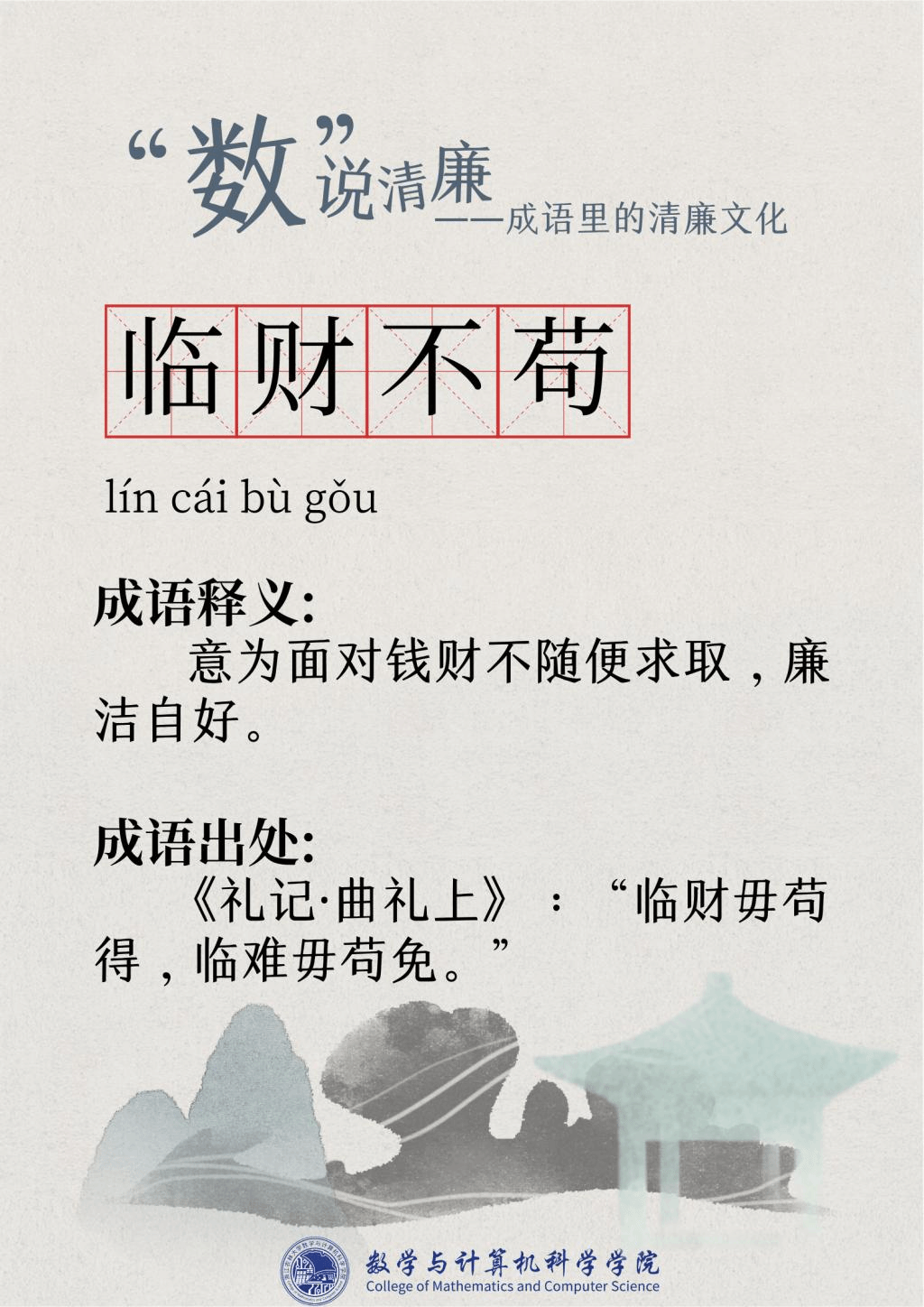 “廉洁”一词最早出现在屈原的作品“宁廉洁正直以自清”中。为人清廉正直从古至今都被视作立身处世最重要的品质之一。习近平总书记曾强调要“加强新时代廉洁文化建设涵养求真务实,团结奋斗的时代新风”。为深入挖掘中华传统文化中数字与成语诗词结合的廉洁要素,展现“廉洁”在中国传统文化瑰宝中浓墨重彩的独特地位,充分发挥清廉文化浸润校园、春风化雨的积极作用,K1体育现推出“数”说清廉——成语里的清廉文化系列文章,以传统文化之土壤培育清廉之花。
