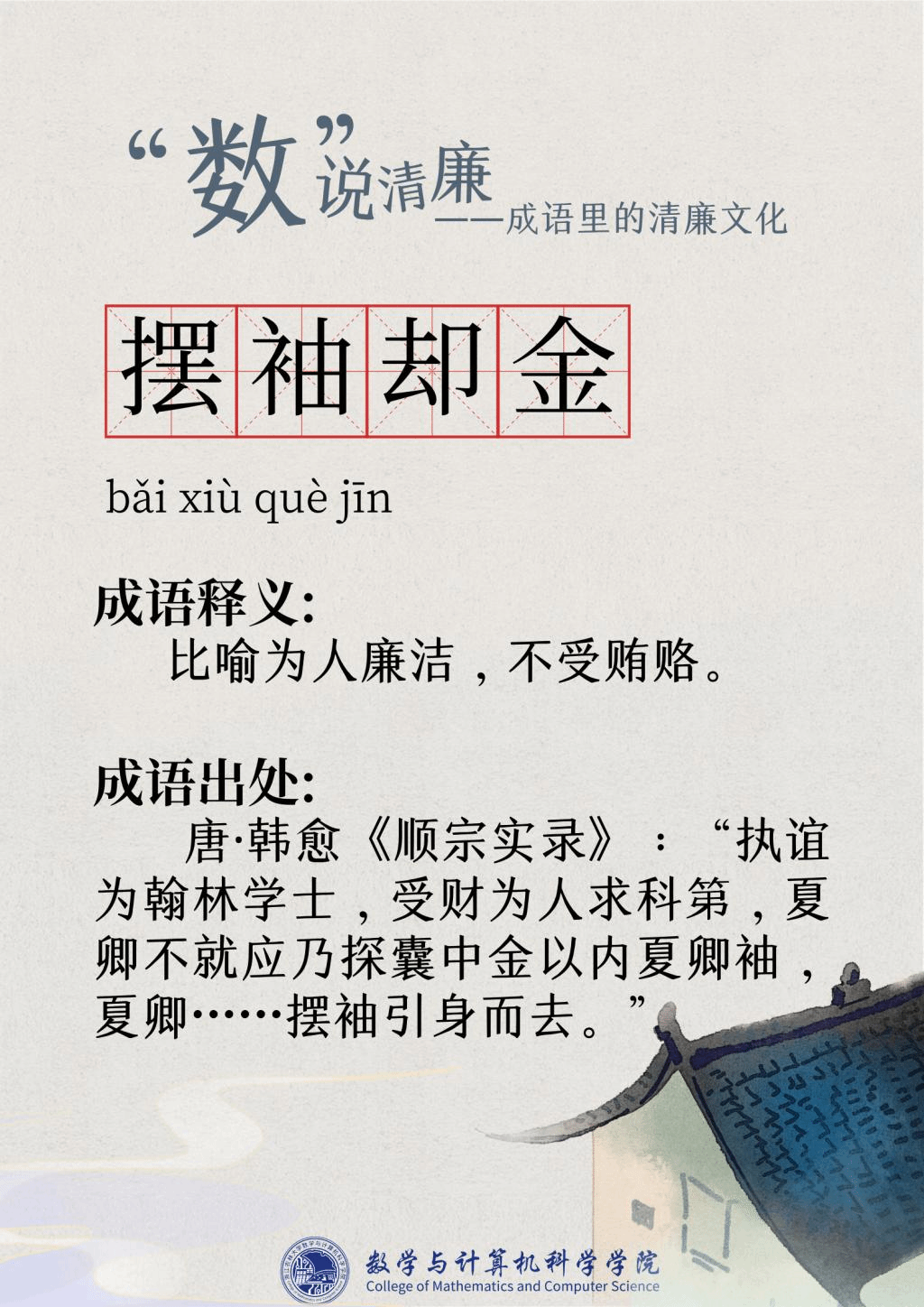 “廉洁”一词最早出现在屈原的作品“宁廉洁正直以自清”中。为人清廉正直从古至今都被视作立身处世最重要的品质之一。习近平总书记曾强调要“加强新时代廉洁文化建设涵养求真务实,团结奋斗的时代新风”。为深入挖掘中华传统文化中数字与成语诗词结合的廉洁要素,展现“廉洁”在中国传统文化瑰宝中浓墨重彩的独特地位,充分发挥清廉文化浸润校园、春风化雨的积极作用,K1体育现推出“数”说清廉——成语里的清廉文化系列文章,以传统文化之土壤培育清廉之花。