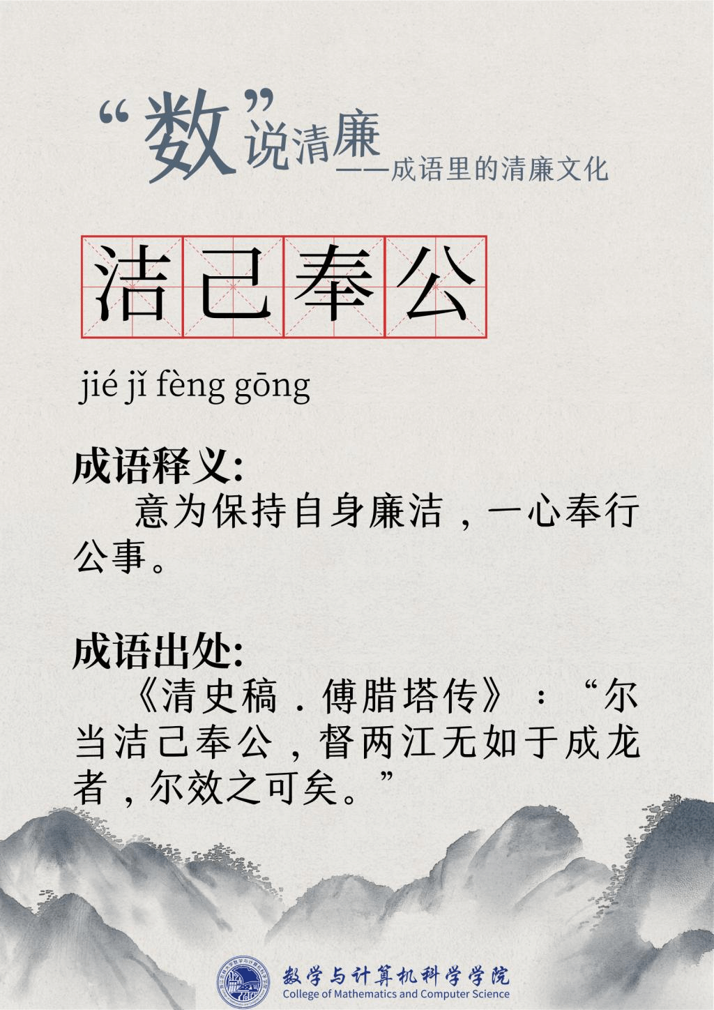 “廉洁”一词最早出现在屈原的作品“宁廉洁正直以自清”中。为人清廉正直从古至今都被视作立身处世最重要的品质之一。习近平总书记曾强调要“加强新时代廉洁文化建设涵养求真务实,团结奋斗的时代新风”。为深入挖掘中华传统文化中数字与成语诗词结合的廉洁要素,展现“廉洁”在中国传统文化瑰宝中浓墨重彩的独特地位,充分发挥清廉文化浸润校园、春风化雨的积极作用,K1体育现推出“数”说清廉——成语里的清廉文化系列文章,以传统文化之土壤培育清廉之花。