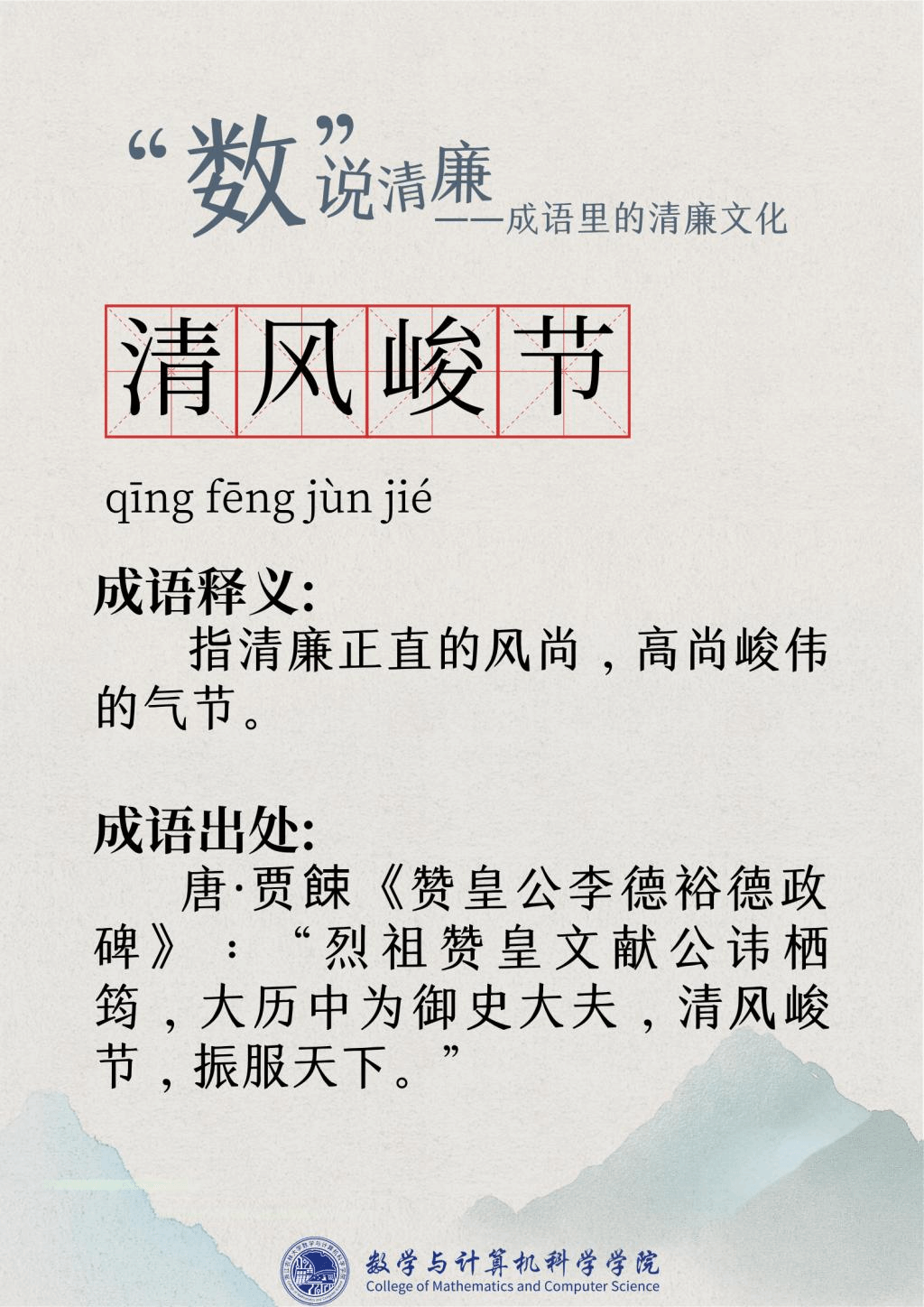 “廉洁”一词最早出现在屈原的作品“宁廉洁正直以自清”中。为人清廉正直从古至今都被视作立身处世最重要的品质之一。习近平总书记曾强调要“加强新时代廉洁文化建设涵养求真务实,团结奋斗的时代新风”。为深入挖掘中华传统文化中数字与成语诗词结合的廉洁要素,展现“廉洁”在中国传统文化瑰宝中浓墨重彩的独特地位,充分发挥清廉文化浸润校园、春风化雨的积极作用,K1体育现推出“数”说清廉——成语里的清廉文化系列文章,以传统文化之土壤培育清廉之花。
