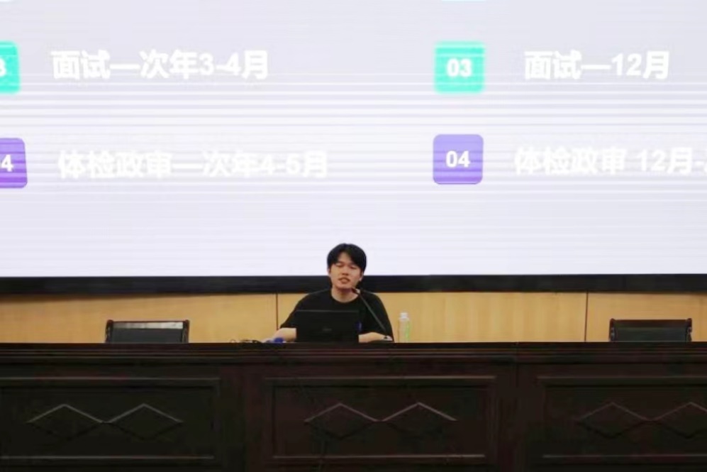 2024届毕业生代表官洪林、朱润昊分享了考研备考过程中的时间规划、复习资料建议、心态调整及面试准备经验,为在座的员工提供了宝贵的第一手资料。李科艺就考公中选岗、备考和面试提出了建议,鼓励同学们在备考中要调整好心态,积极备考。此外,会议还邀请了跨洋留学通的何亚成老师为同学们带来出境留学规划分享,拓宽了大家的升学思路。
