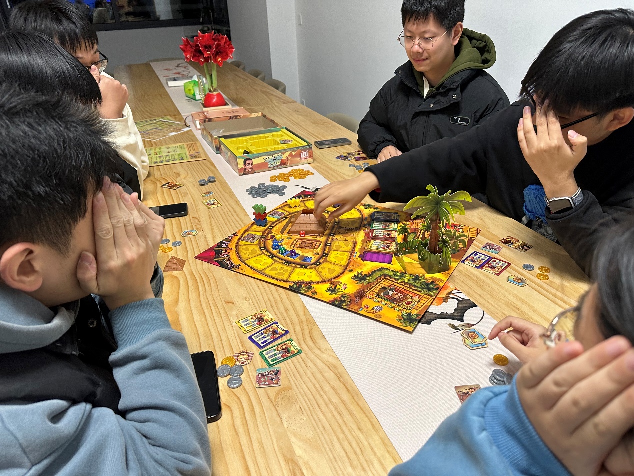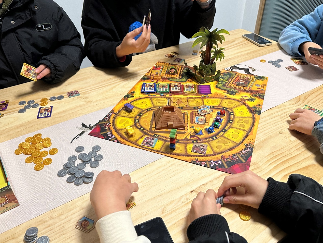 活动的核心游戏——“骆驼快跑”是一款以模拟骆驼赛跑投注为主题的益智类桌游,背景设定在金字塔脚下。玩家们扮演赛马投注者,通过押注骆驼的排名与表现,目标是在紧张的比赛过程中赢取丰厚奖金。游戏要求玩家通过合理的策略规划、对赛局的实时观察与分析,以及对心理博弈的精准把握,最大化自己的收益。这款游戏不仅考验了同学们的推理能力,还激发了大家对复杂局面的快速反应能力,充满了刺激与挑战。