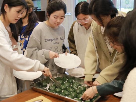 依照详细的指引和指导,同学们很快上手。青汁与糯米粉揉和而成的面团包裹住清甜的豆沙或鲜咸的嫩笋,经过同学们的双手揉搓,一个个色如碧玉、糯韧绵软、清香扑鼻的青团很快做好了。同学们纷纷与自己亲手做的青团拍照留念,并彼此分享制作心得,每个人的脸上都洋溢着幸福的微笑。趁着厨房蒸青团的功夫,同学们结伴到餐厅外与鲜嫩的春色合影。青团蒸熟,香气弥漫在空气中,仿佛将春天的味道都凝聚在了这小小的吃食之中,一口咬下去,软糯可口、令人回味。