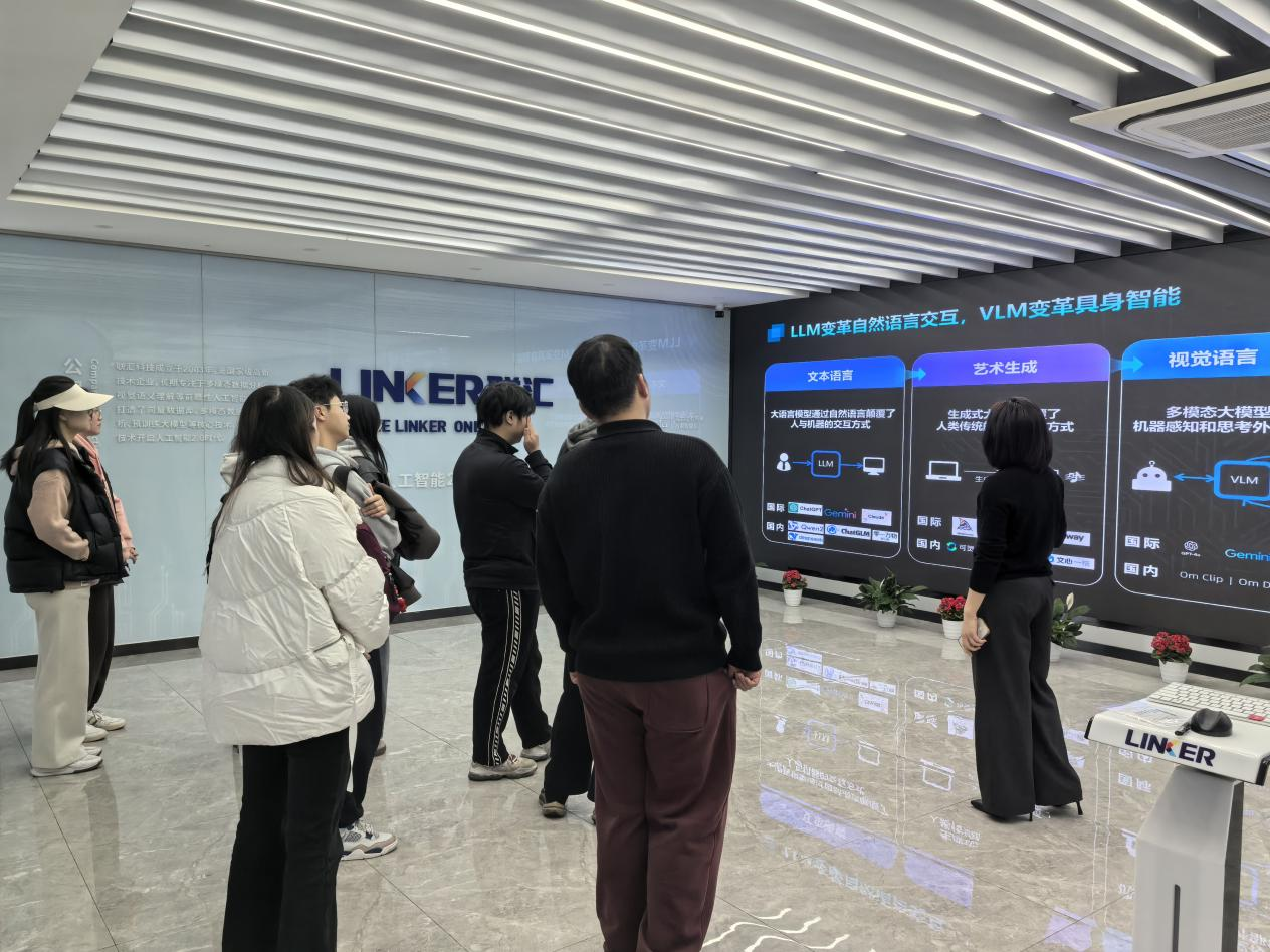 在联汇科技展厅,企业负责人向师生展示了公司在多模态人工智能、大数据分析等领域的创新成果,重点介绍了其自主研发的"OmModel"多模态大模型在智慧城市、智能客服等场景的应用案例。并且详细解读了企业的人才需求方向,指出"算法优化能力"和"跨领域实践能力"是当前招聘的核心关注点。现场员工踊跃提问,围绕职业发展路径、实习岗位要求等问题与企业代表深入探讨。