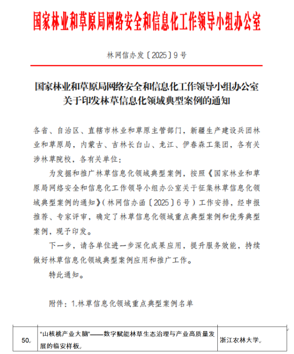 近日,公司“山核桃产业大脑”——数字赋能林草生态治理与产业高质量发展的临安样板项目凭借创新性技术应用和显著成效,成功入选国家林业和草原局林草信息化领域重点典型案例,成为全校唯一获此殊荣的项目。